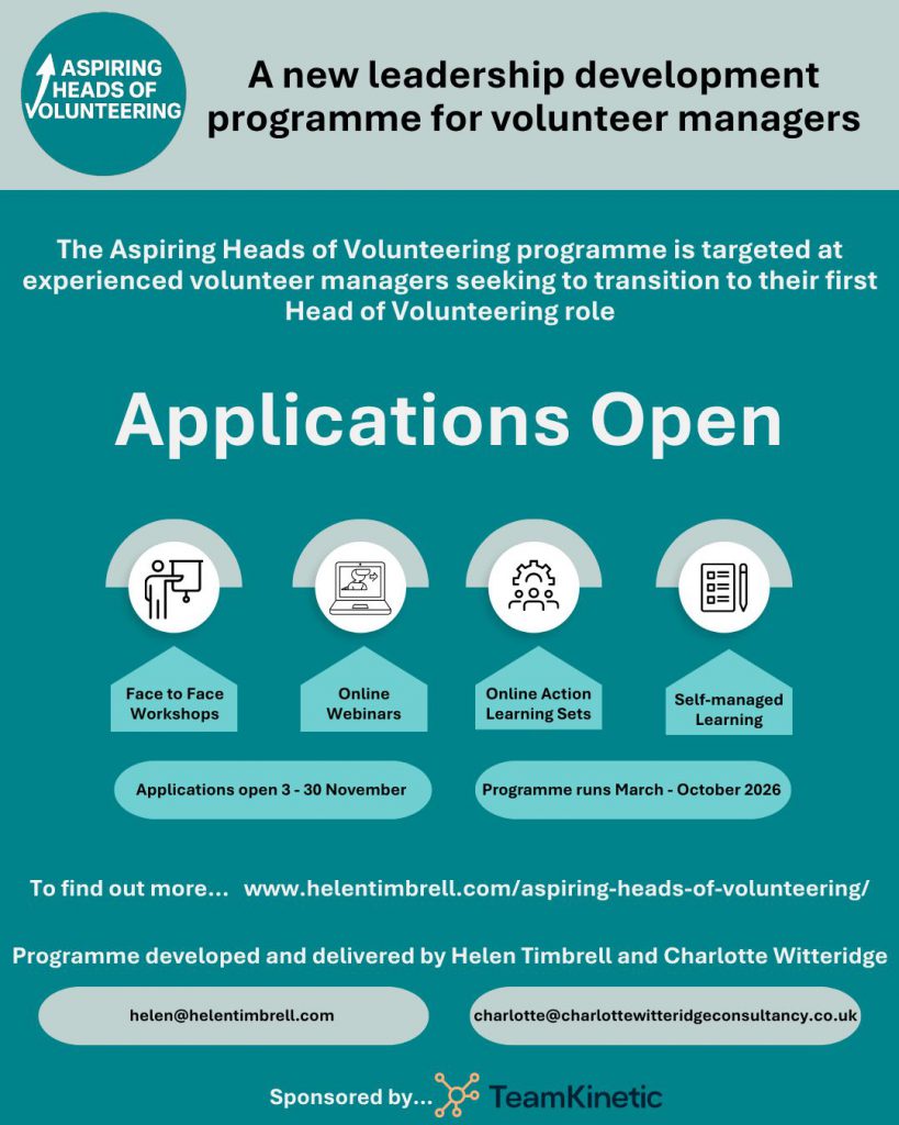 Dr Helen Timbrell and Charlotte Witteridge are bringing you a new leadership development programme for volunteer managers. The Aspiring Heads of Volunteering Programme supports those looking to move from day-to-day volunteer management into their first Head of Volunteering role.