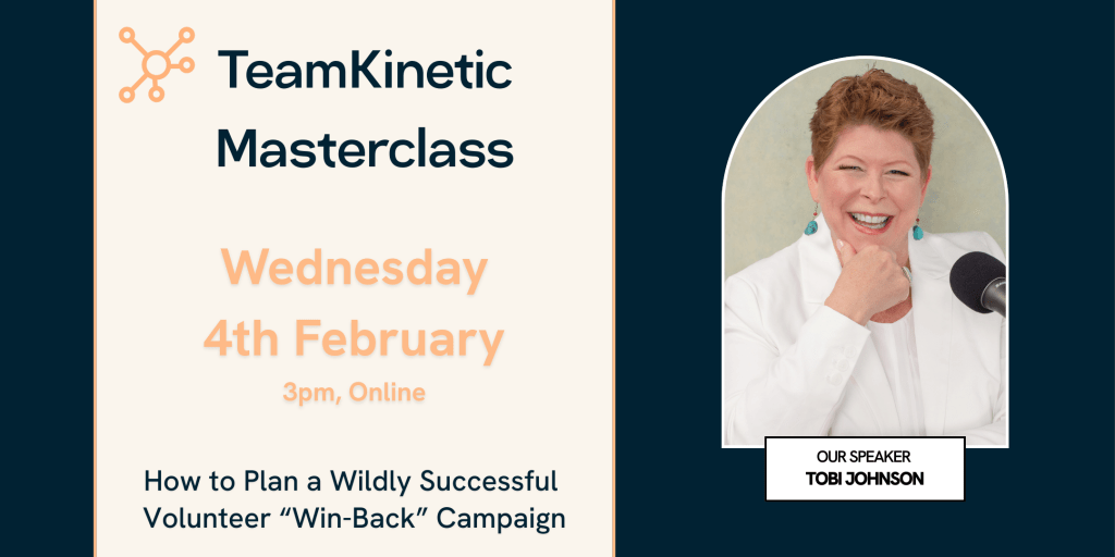 Next up in our Masterclass series, we’re joined by Tobi Johnson. Tobi is an expert in all things volunteer management and has been sharing her wisdom via VolunteerPro since 2015. She’s joining us to discuss how to re-engage lost volunteers. Or, in her words, “How to Plan a Wildly Successful Volunteer “Win-Back” Campaign”!
